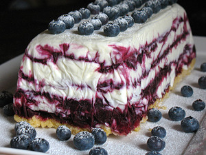 Вытащить форму из морозильника, поверх застывшего творожного слоя положить 3 столовые ложки черничного пюре и разровнять