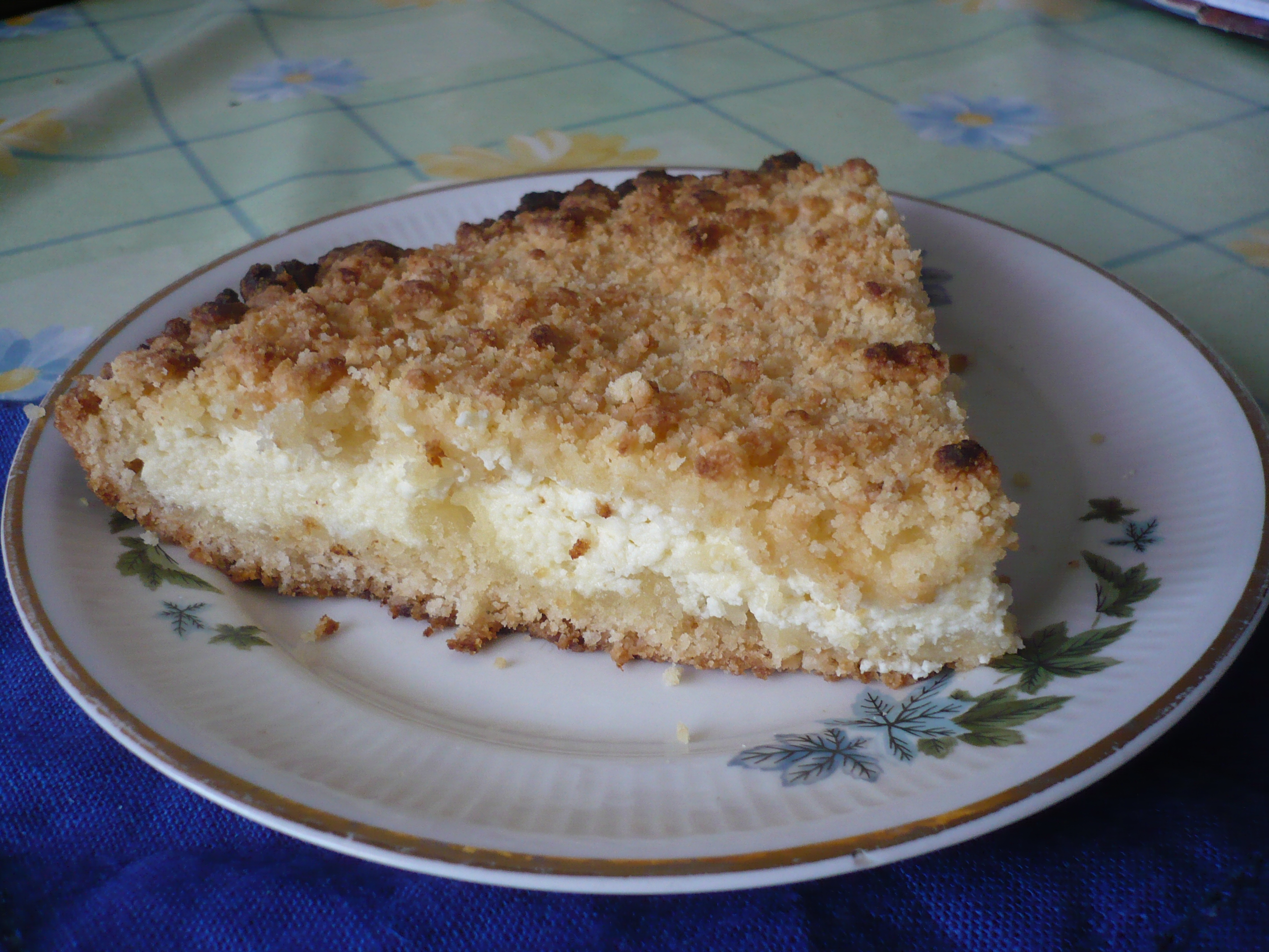 ½ часть крошки выложить в форму смазаннуюрастительным маслом и разровнять. Сверху выложить ровным слоем начинку,затем оставшееся тесто. Все разровнять и поставить в разогретую духовкуна средний огонь. Готовность проверяю спичкой. А сверху пирог долженнемного зарумяниться.
