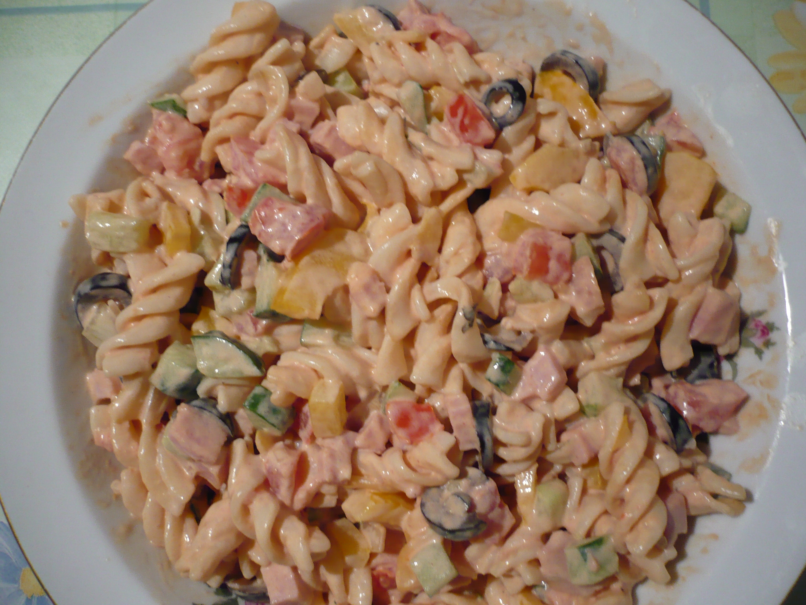 Болгарский перец, помидоры, огурцы, лук репчатый. Добавить оливки и ветчину.Заправка:кетчуп+сметана=50/50