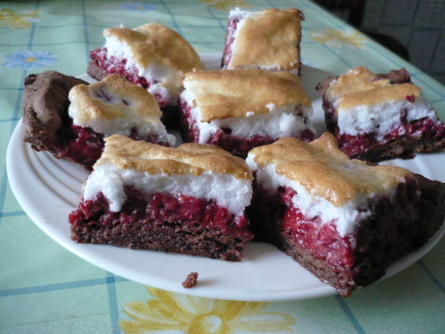 4 желтка,1 яйцо,3/4ст.сахара,2 ст.л.какао,1 ст.муки.Испечь до полуготовности,выложить ягоды,полить белковую пену.
