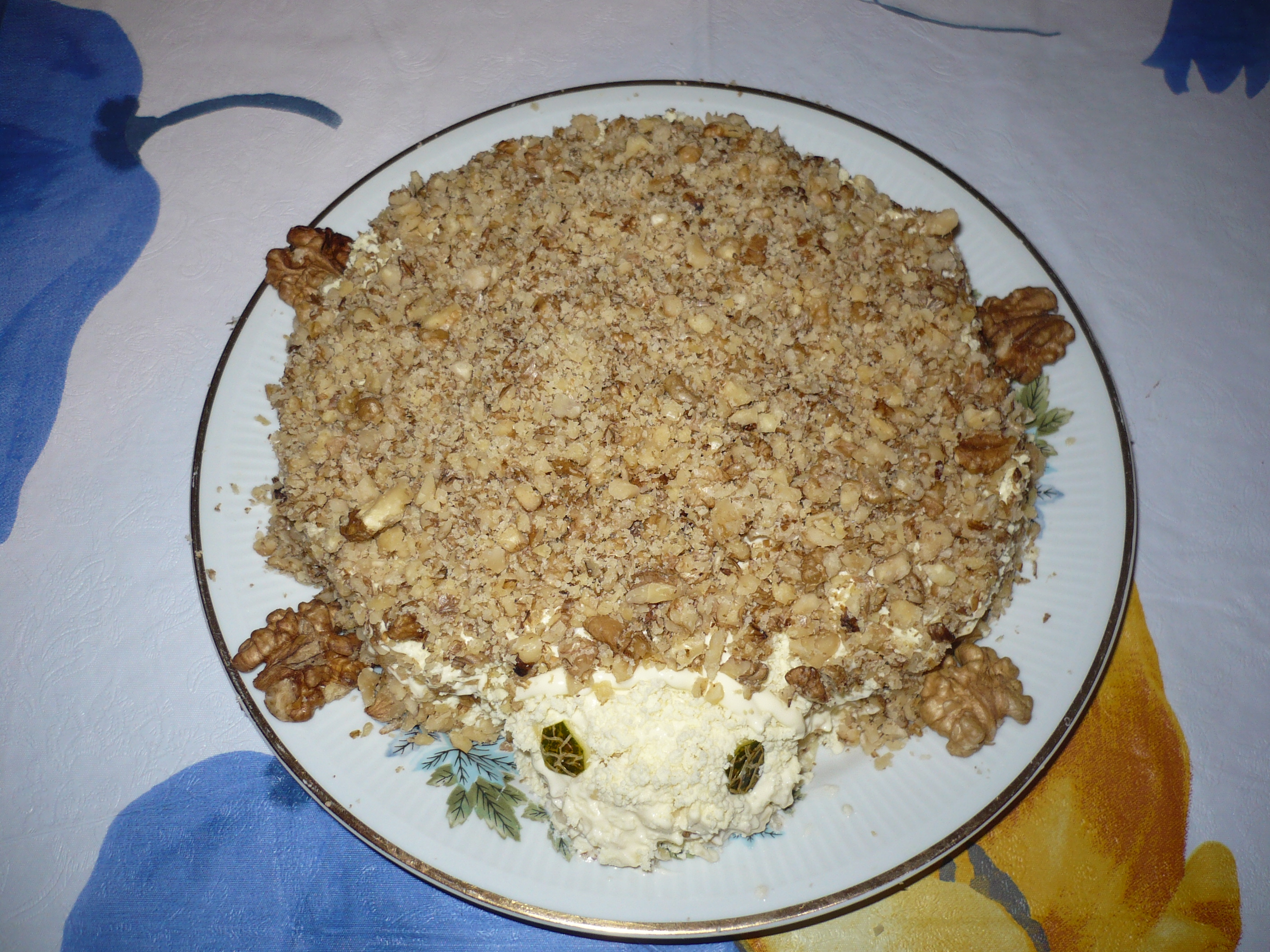 Очерёдность слоёв: Белок, филе, лук, яблоко, сыр,желток, орехи