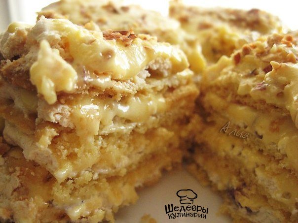 Масло взбить со сгущенкой. Готовые остывшие коржи перемазать масляным кремом.Сверху посыпать орешками. Торт обязательно должен настояться. Не пропитаться, а именно настояться. Если я пеку торт вечером, то утром мы его уже едим. Но вкуснее всего торт с третьего-четвертого дня.