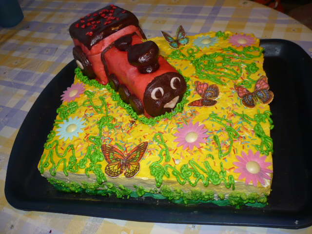 Остатки крема № 2 покрасить в салатовый цвет и сделать"травку",украсить вафельными цветами и бабочками.