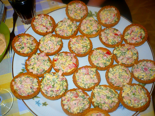 ветчина кубиками+сыр на мелкой тёрке+чеснок на тёрке+зелень+помидор кубиками+майонез.Всё перемешивается и выкладывается на тарталетки.