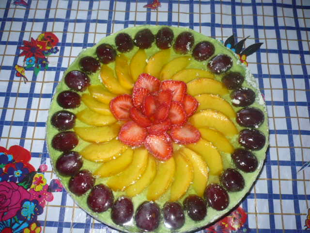 В кипячённой воде развести желатин и пакетик клубничного желе. Постепенно нагревая, дождаться полного растворения, добавить ром.Остудить. Клубнику (можно замороженную) засыпать сахаром, прогреть на медленном огне, помешивая, до растворения сахара, протереть сквозь сито. Получится довольно густое пюре.Коржи уменьшить в диаметре до 20,5 см. Я накрыла подходящей по размеру крышкой и обрезала излишки острым ножом по окружности.Для крема взбить сливки с сахарной пудрой, осторожно подмешать к ним рикотту и часть желейной массы.Донышко разъёмной формы застелить пищевой плёнкой или бумагой для выпечки (чтобы не подтекало желе)На донышко от разъёмной формы (без бортиков) ровно в центр выкладываем первый корж, смазываем его 1/3 клубничного пюре и наносим крем 1/3, накрываем следующим коржом, операцию повторяем, накрываем третьим коржом и смазываем третий корж только пюре.Аккуратно надеваем на "торт" открытые бортики для формы.В получившийся зазор между тортом и бортом формы (не закрывать!!)выкладываем сливочный крем.Только после этого закрываем кольцо на замок.Убираем в холодильник на несколько минут.Выкладываем красиво фрукты на торт и желейной массой потихоньку,по столовой ложке выливаете желе.Лучше сначала чуть-чуть полить фрукты и поставить торт на 5-10 мин. в холодильник,чтобы фрукты застыли на торте,а потом заливаете остальное желе.Торт убрать на 1-2 часа в холодильник.