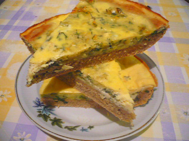 3 яйца взбить вилкой с солью,добавить 4 ст. л.сметаны или кефира,1 ст.л.муки,всё взбить.Залить этой массой сверху пирог и отправить в духовку до полной готовности.