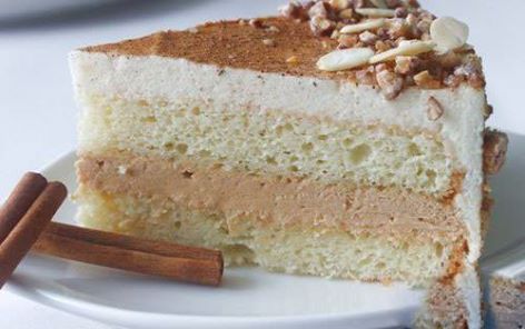 8.Для сборки торта выложить бисквитный корж, сверху на него выложить весь карамельный крем, затем еще один корж, а сверху яблочное пюре. Готовый торт поставить в холодильник на 4-6 часов. Торт можно украсить молотой корицей, орешками или дольками яблок.