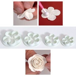 Раскатать пасту нужного цвета слоем до 3 мм. С помощью штампа вырезать фигурки, затем последовательно собрать из них розу.