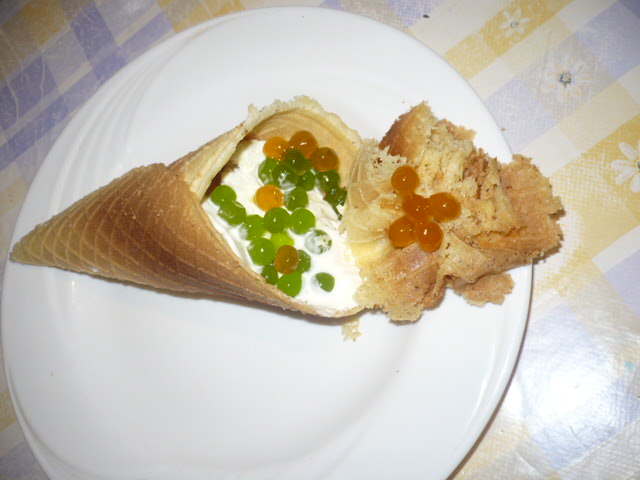 1 п.ванилина.),скрутила в конус,на дно конуса налила топлёный шоколад(чтобы мороженое не протекало)и на 15 мин.в холодильник(чтобы шоколад застыл).Всё,вафельные конвертики для мороженого готовы!!!