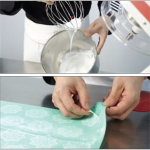 100 г премикса МЭДЖИК ДЕКОР и 80-100 г теплой воды смешать в планетарном миксере на средней скорости в течение 2 минут. Распределить массу по рельефному коврику (арт.TMD01- TMD04) при помощи шпателя или скребка, заполняя все пустоты, и оставить высыхать в течение 3-4 часов. Для сокращения фазы сушки, коврик с массой можно поместить в духовку на 10-15 минут при температуре 80 С или при 120 С на 5-6 минут. Отделить застывший декор, начав с угла коврика, аккуратно помогая скребком. Украсить торт.