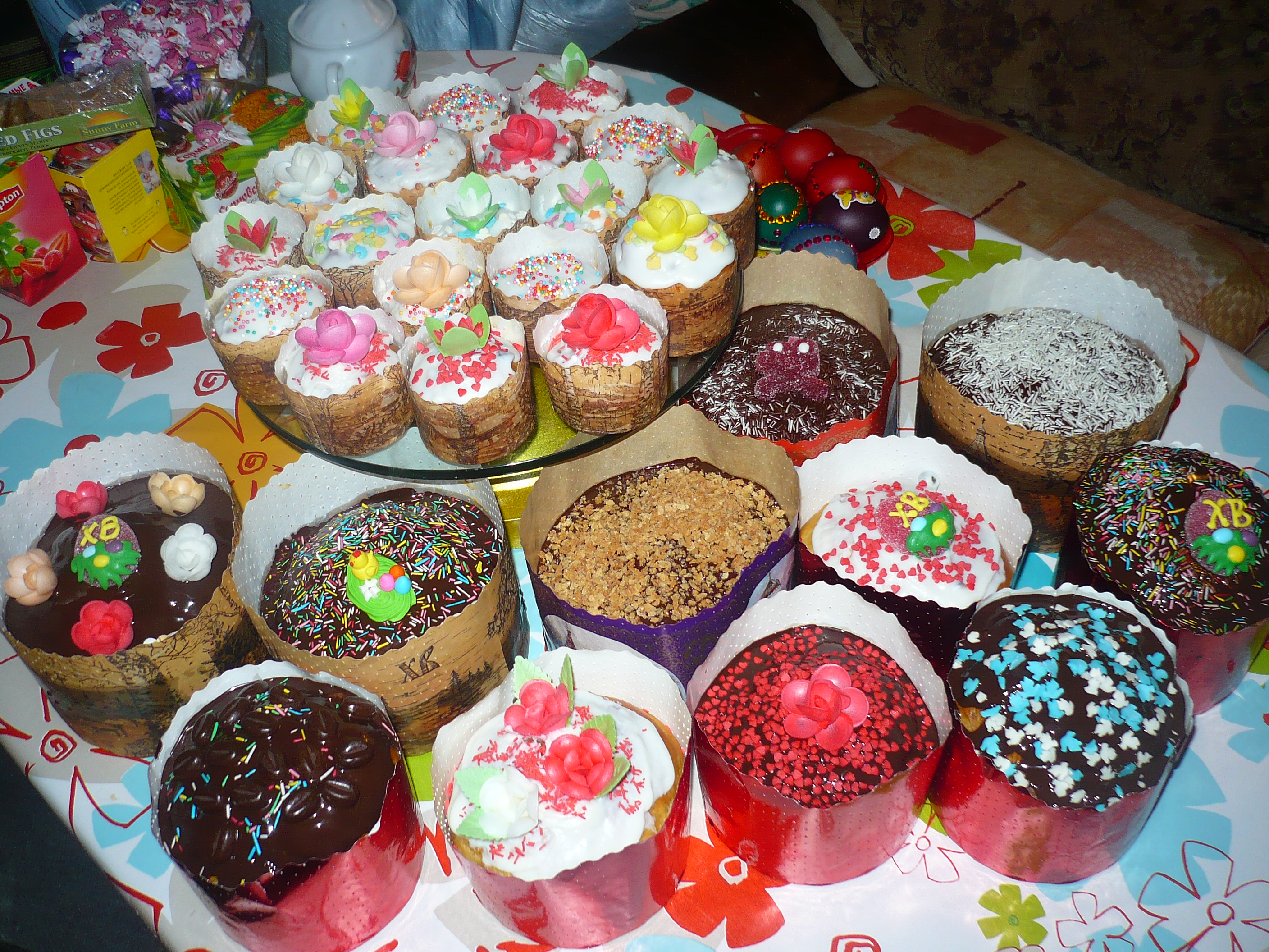 Готовые горячие куличи смазать глазурью и посыпать кондитерской посыпкой или украсить цукатами.