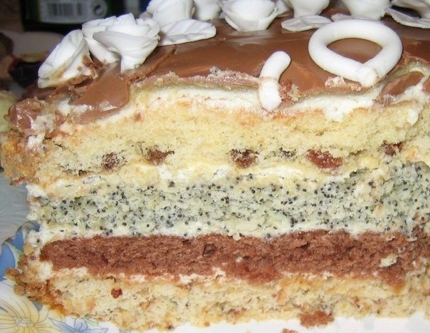 Всё смешать и добавить в один корж изюм, в один корж какао, в один корж мак, в один корж орехи по вкусу.