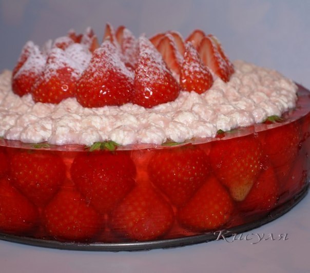 Теперь выкладываем второй ряд клубники (хвостиками вверх) в промежутки между ягодами нижнего слоя. Заливаем желе до верха торта. Ставим застывать.