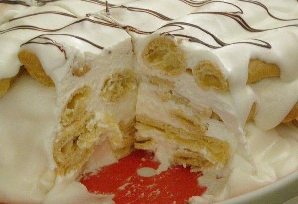 Нагреть в кастрюле сливочное масло и воду. Довести до кипения, постоянно помешивая, пока масло не растает. Когда вода закипит, выключить огонь, добавить муку и быстро замесить тесто. Добавить яйца по одному за раз и перемешать до однородности. У вас должно получиться мягкое густое тесто. Разогреть духовку до 200 градусов. Выстелить противень пергаментной бумагой. С помощью кондитерского шприца или мешка выдавить на противень эклеры длиной от 5 до 10 см. Выпекать 20 минут, затем уменьшить температуру до 150 градусов и выпекать в течение 5-7 минут. Выключить духовку, приоткрыть дверцу и дать остыть. Чтобы приготовить крем, взбить сметану с сахаром. Обмакнуть каждый эклер в крем и выложить в разъемную форму. Залить оставшимся кремом. Поставить форму в холодильник на 4-5 часов (лучше на ночь). За это время эклеры должны хорошо пропитаться кремом. За час до подачи приготовить шоколадную глазурь. Поместить шоколад в миску, установленную над кастрюлей с кипящей водой. Помешивать до полного растворения шоколада. Извлечь торт из формы и полить растопленным шоколадом. Поставить в холодильник и дать шоколаду застыть.