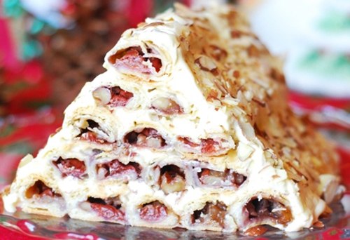 - 1 трубочка, весь торт хорошо обмазываем кремом, посыпаем тертым орехом или шоколадом и на пропитку в холодильник часов на 5.