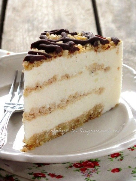 На дно положите первый корж, на него 1/3 начинки, затем один из белковых коржей, еще 1/3 начинки, второй белковый корж, оставшуюся начинку. Можно поставить торт в холодильник, а можно убрать на несколько дней в морозилку, как я и сделала. Очень удобно готовить такой торт заранее. Если торт предназначается для вечернего чаепития, то утром его нужно переставить из морозилки в холодильник, чтобы он полностью разморозился.