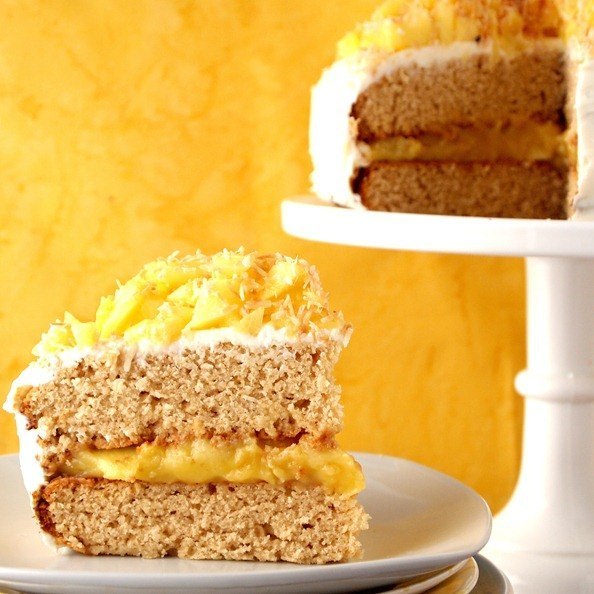 Выложите первый корж. Смажьте помадкой первый корж, выложите кусочки свежего ананаса и закройте вторым коржом. По всей поверхности торта нанесите глазурь. В качестве верхушки выложите свежий ананас (можно консервированный) и присыпьте кокосовой стружкой.