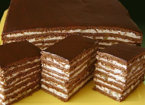 Коржи перемазать заварным кремом, посыпая орехами. Оставить при комнатной температуре на 1 — 2 часа, чтобы коржи пропитались.