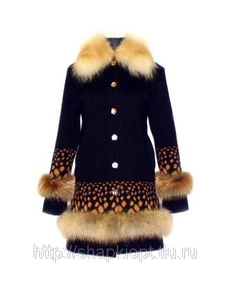 По рукавам, полочкам и спинке на трикотаже рисунок. Воротник отложной. По воротнику, подолу и на манжетах нашит мех рыжей лисы. По бокам карманы. Рекомендуемые размеры от 44 до 64, длина изделия от 55 до 75 сантиметров. Пальто рекомендуется для прохладной погоды.
